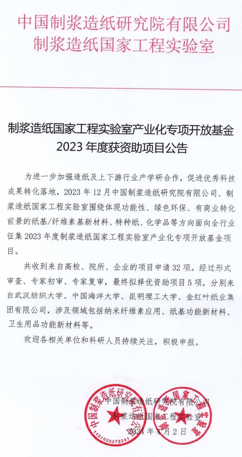 為進(jìn)一步加強(qiáng)造紙及上下游行業(yè)產(chǎn)學(xué)研合作,促進(jìn)優(yōu)秀科技成果轉(zhuǎn)化落地,中國制漿造紙研究院、制漿造紙國家工程實驗室啟動征集了2023年度制漿造紙國家工程實驗室產(chǎn)業(yè)化專項開放基金項目,得到了行業(yè)相關(guān)機(jī)構(gòu)的大力支持,現(xiàn)對征集和最終評審情況予以公告。歡迎各相關(guān)單位和科研人員持續(xù)關(guān)注該基金后續(xù)征集活動,積極申報。