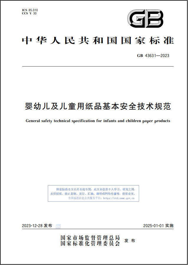 GB 43631—2023《嬰幼兒及兒童用紙品基本安全技術(shù)規(guī)范》強(qiáng)制性國家標(biāo)準(zhǔn)于2023年12月28日發(fā)布,并將于2025年1月1日起正式實(shí)施。該標(biāo)準(zhǔn)規(guī)定了嬰幼兒及兒童用紙品的分類、要求、標(biāo)識(shí),描述了相應(yīng)的試驗(yàn)方法,適用于在我國境內(nèi)生產(chǎn)、銷售的供6歲(及)以下嬰幼兒及兒童使用的紙品,主要包括嬰兒紙尿褲(片、墊)、嬰幼兒及兒童用紙巾、衛(wèi)生紙、濕巾、文化用紙、紙板、紙質(zhì)書本和讀物等產(chǎn)品。具體要求包括重金屬、可遷移元素、可遷移性熒光物質(zhì)、丙烯酰胺、甲醛、揮發(fā)性有機(jī)化合物、防腐劑、鄰苯二甲酸酯、可分解致癌芳香胺染料等。
