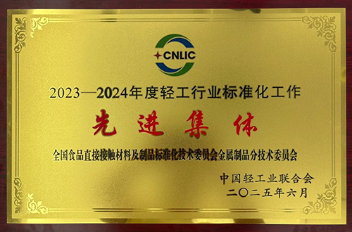中國食品發(fā)酵工業(yè)研究院承擔秘書處單位的全國食品直接接觸材料及制品標準化技術(shù)委員會金屬制品分技術(shù)委員會獲得023—2024年度輕工行業(yè)標準化工作先進集體”榮譽稱號。