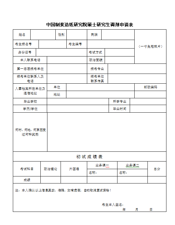 1、在研招網(wǎng)調(diào)劑系統(tǒng)開通之前,請符合調(diào)劑條件的考生將申請材料以電子版形式發(fā)至郵箱(rsjyb@cnppri.com.cn)。申請材料包括:(1)《中國制漿造紙研究院碩士研究生調(diào)劑申請表》(見附件),(2)個人簡歷,(3)大學(xué)成績單掃描件。