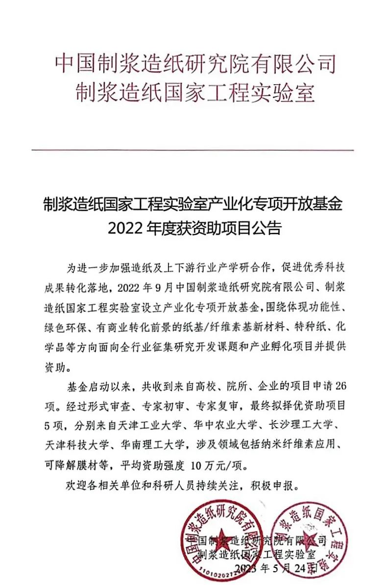 為進(jìn)一步加強(qiáng)造紙及上下游行業(yè)產(chǎn)學(xué)研合作,促進(jìn)優(yōu)秀科技成果轉(zhuǎn)化落地,中國(guó)制漿造紙研究院、制漿造紙國(guó)家工程實(shí)驗(yàn)室于2022年9月首次啟動(dòng)征集制漿造紙國(guó)家工程實(shí)驗(yàn)室產(chǎn)業(yè)化專項(xiàng)開(kāi)放基金,得到了行業(yè)相關(guān)機(jī)構(gòu)的大力支持,現(xiàn)對(duì)征集和最終評(píng)審情況予以公告。歡迎各相關(guān)單位和科研人員持續(xù)關(guān)注該基金后續(xù)征集活動(dòng),積極申報(bào)。